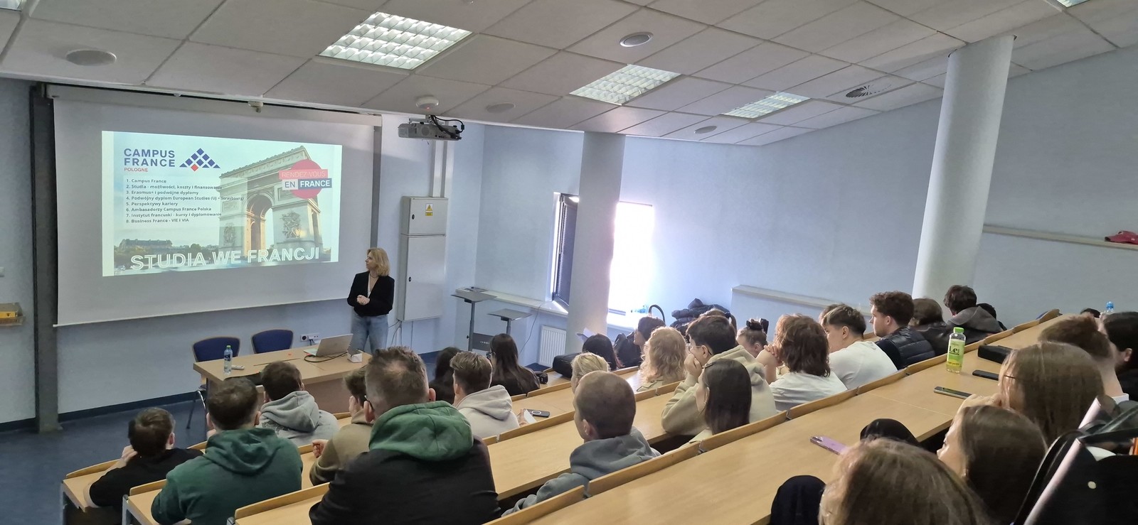 W dniu 11.03.2026 r. studenci Politechniki Rzeszowskiej uczestniczyli w spotkaniu informacyjnym z Panią Iwoną Gorczycą-Polus, koordynatorką oddziału Campus France Polska w Krakowie, instytucji wspierającej kandydatów zainteresowanych studiami we Francji. W trakcie spotkania studenci mogli poznać szerokie możliwości, jakie oferują francuskie uczelnie, ze zwróceniem uwagi na różnorodność programów studiów od inżynierskich i technicznych po humanistyczne i artystyczne, wysoką jakość kształcenia oraz międzynarodowy charakter francuskich kampusów, dostępne programy w języku angielskim, zasady rekrutacji poprzez platformę Études en France, możliwości finansowania studiów, w tym stypendia rządu francuskiego i programy regionalne.