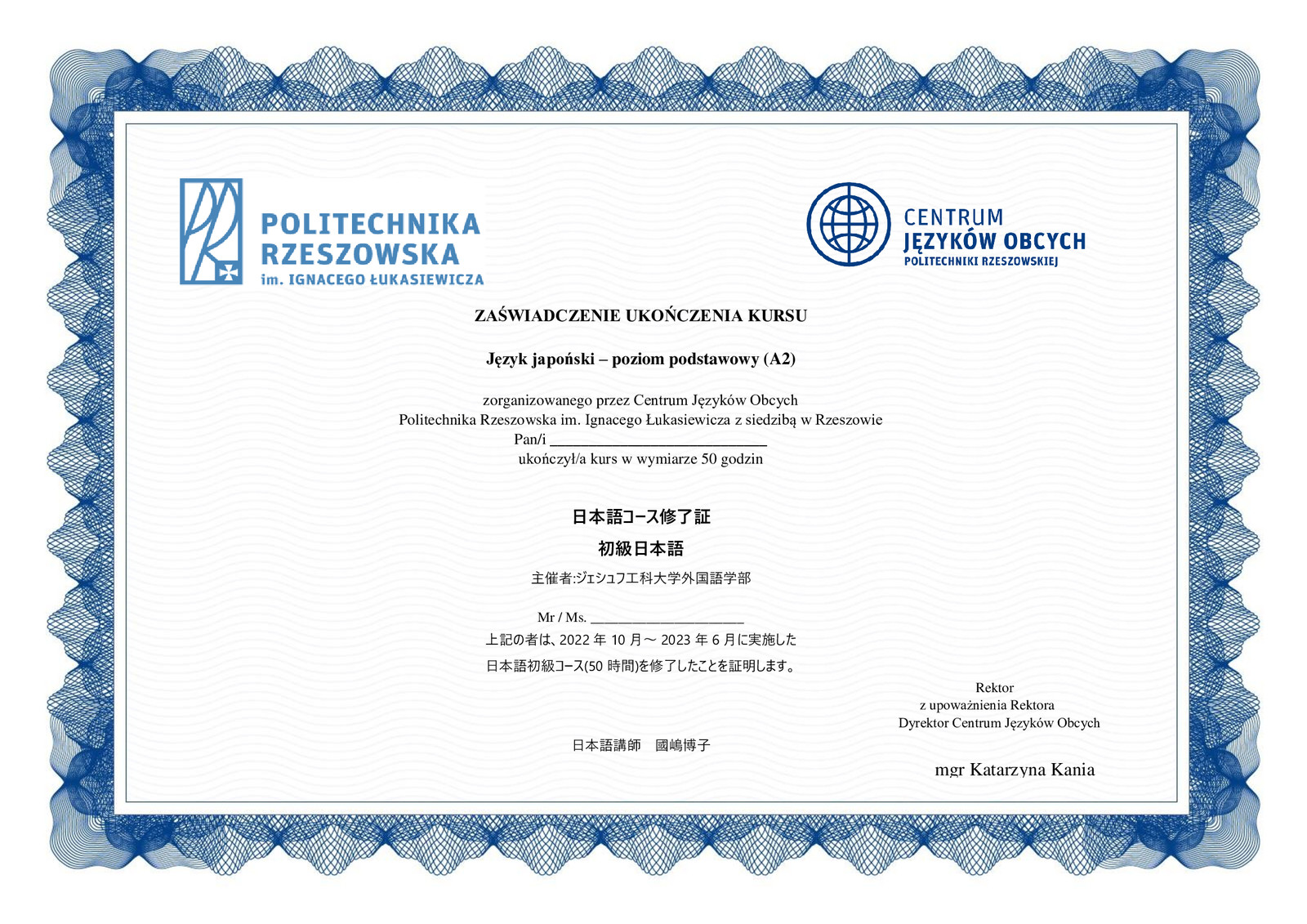 Reprezentanci Uczelni uczestniczyli w roku akademickim w kursie języka japońskiego prowadzonym przez P. Hiroko Kunishimę. W roku akademickim 2023/2024 planowana jest kontynuacja kursu oraz utworzenie nowych grup kursowych.