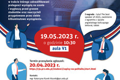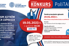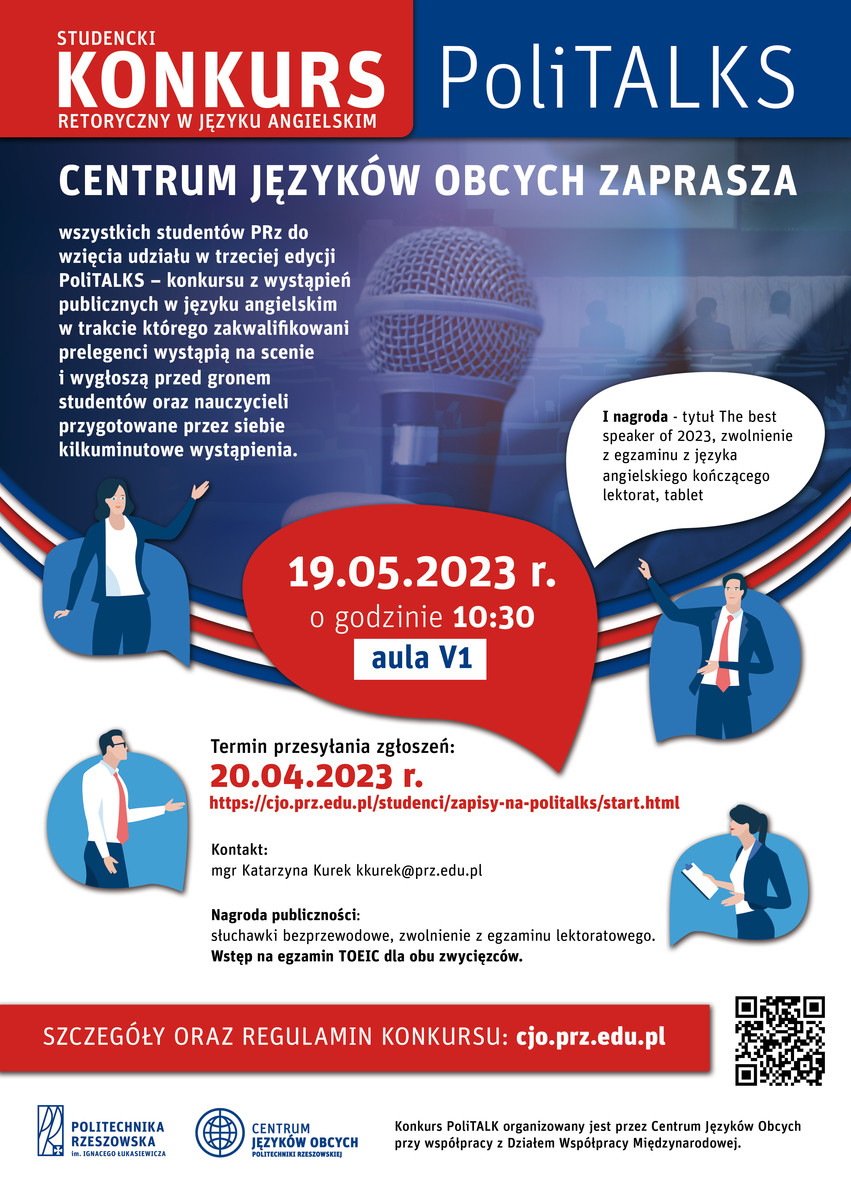 Konkurs PoliTALK organizowany przez Centrum Języków Obcych przy współpracy z Działem Współpracy Międzynarodowej odbędzie się 19.05.2023 o godzinie 10:30 w auli V1. Konkurs skierowany jest do studentów Politechniki Rzeszowskiej, którzy zgłoszą chęć uczestnictwa poprzez wypełnienie formularza zgłoszeniowego w terminie do 20.04.2023. W trakcie wydarzenia ocenione zostaną prezentacje uczestników, a autor najwyżej ocenionego wystąpienia otrzyma zwolnienie z egzaminu lektoratowego, tytuł The Best Speaker of 2023 oraz cenne nagrody rzeczowe. Dodatkowo przewidziana została również nagroda publiczności, zaproszenia na egzamin TOEIC dla obu zwycięzców oraz nagrody rzeczowe dla wszystkich prelegentów biorących udział w konkursie.