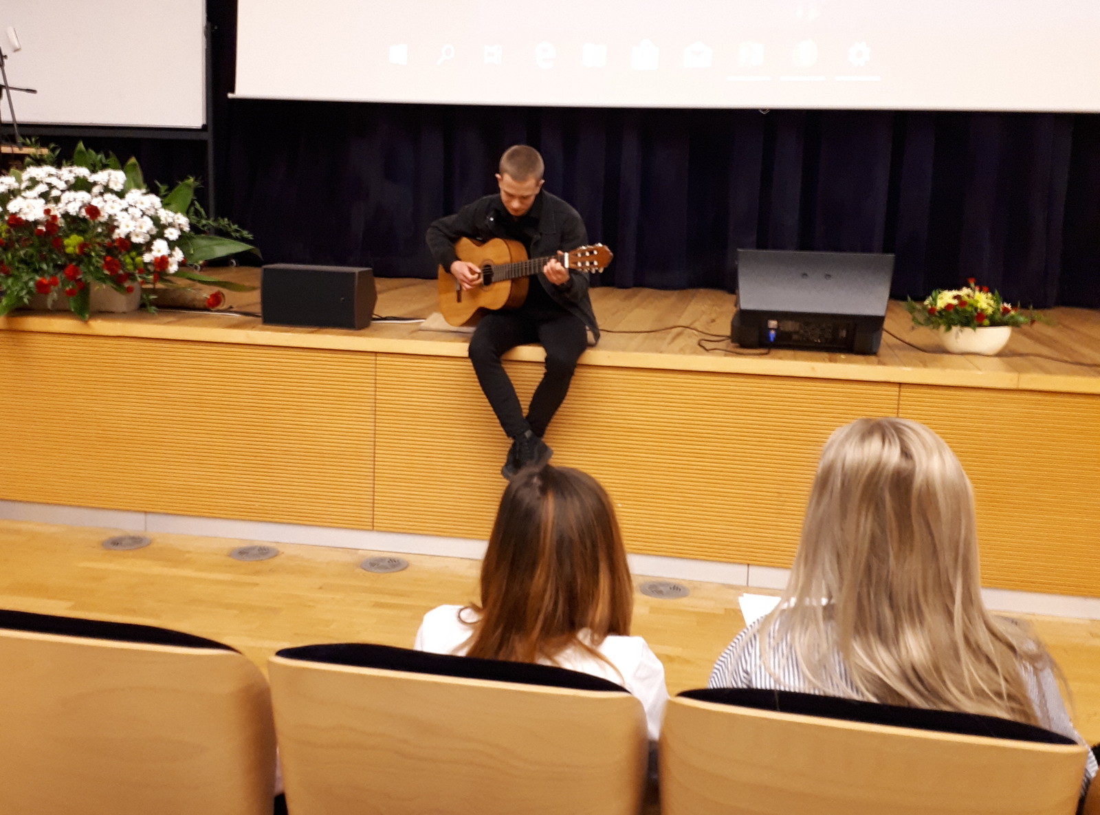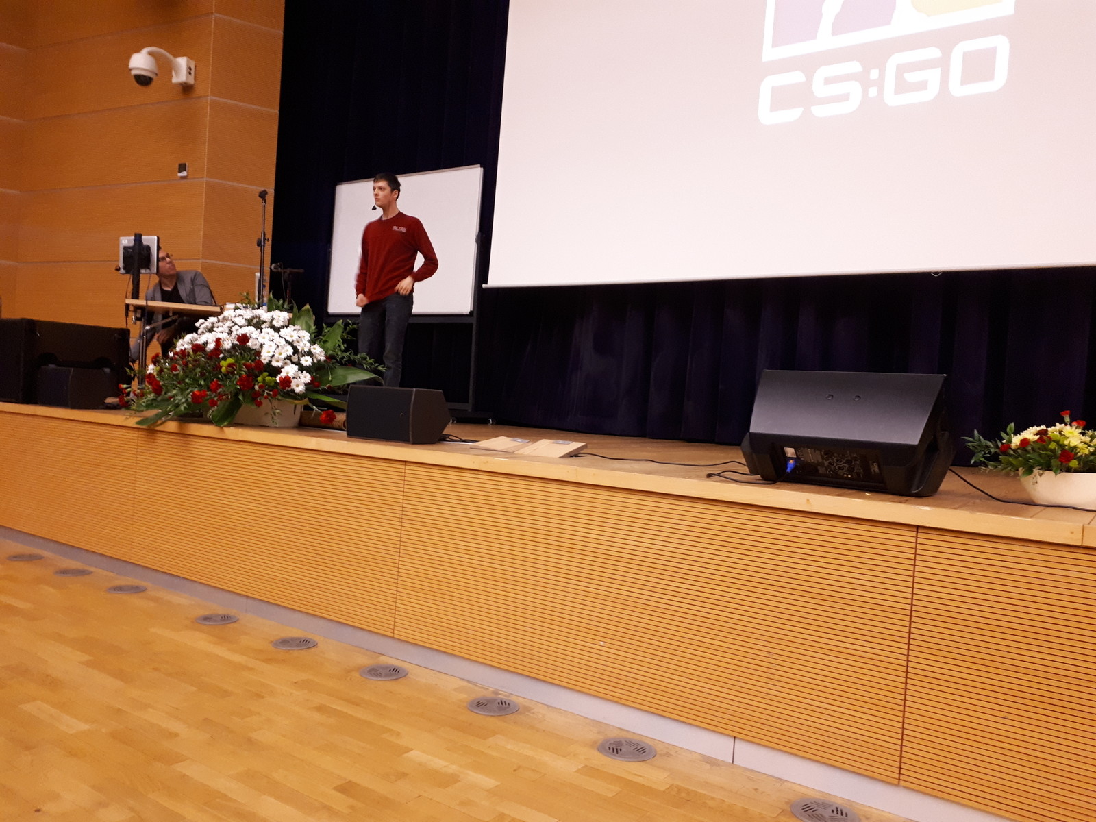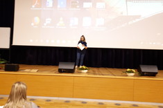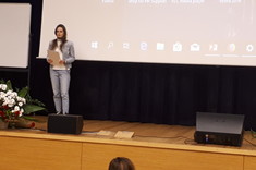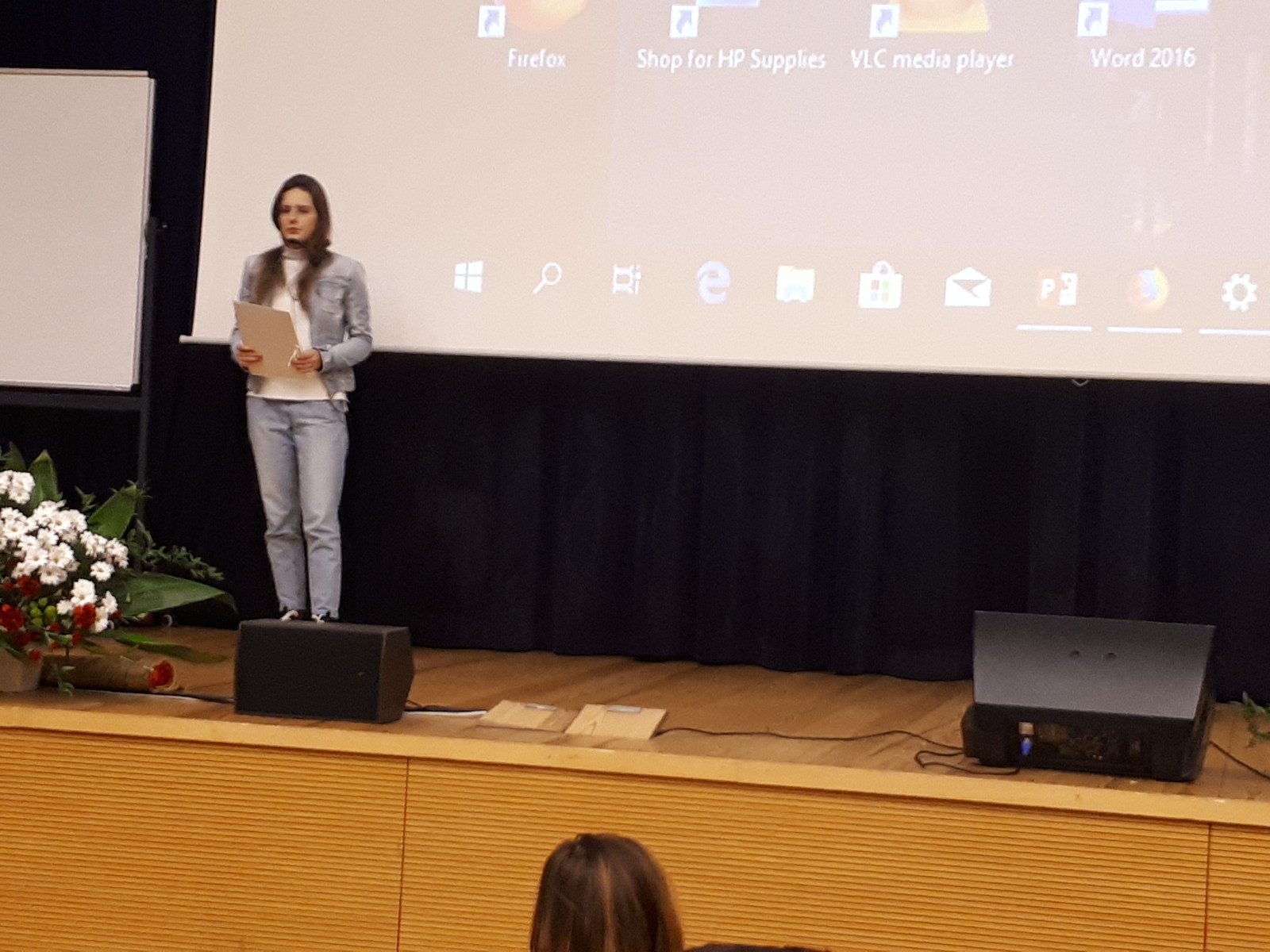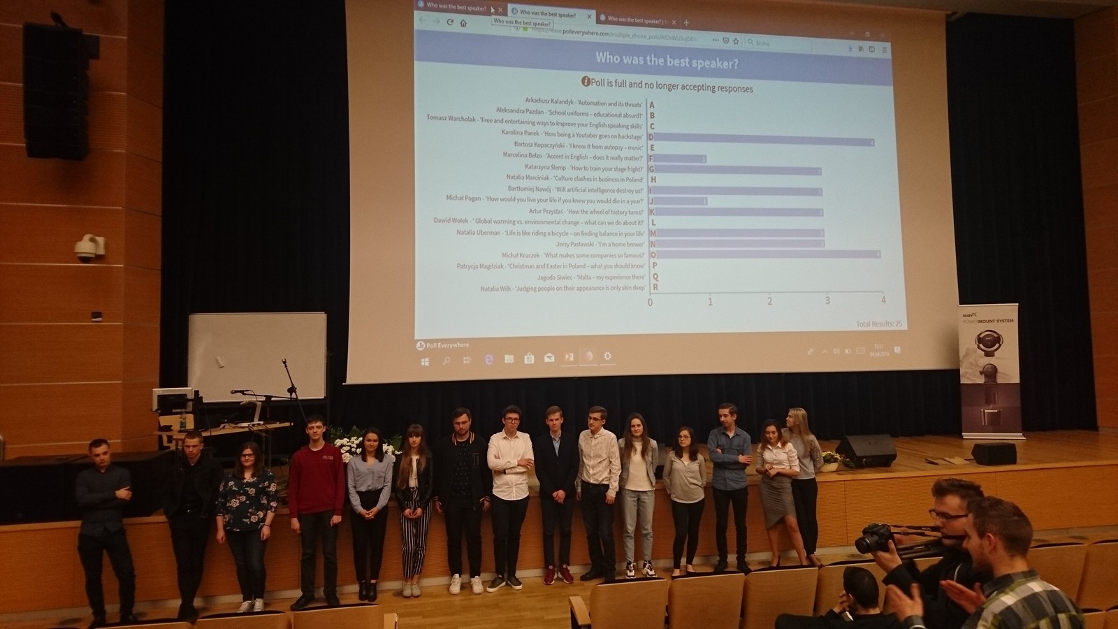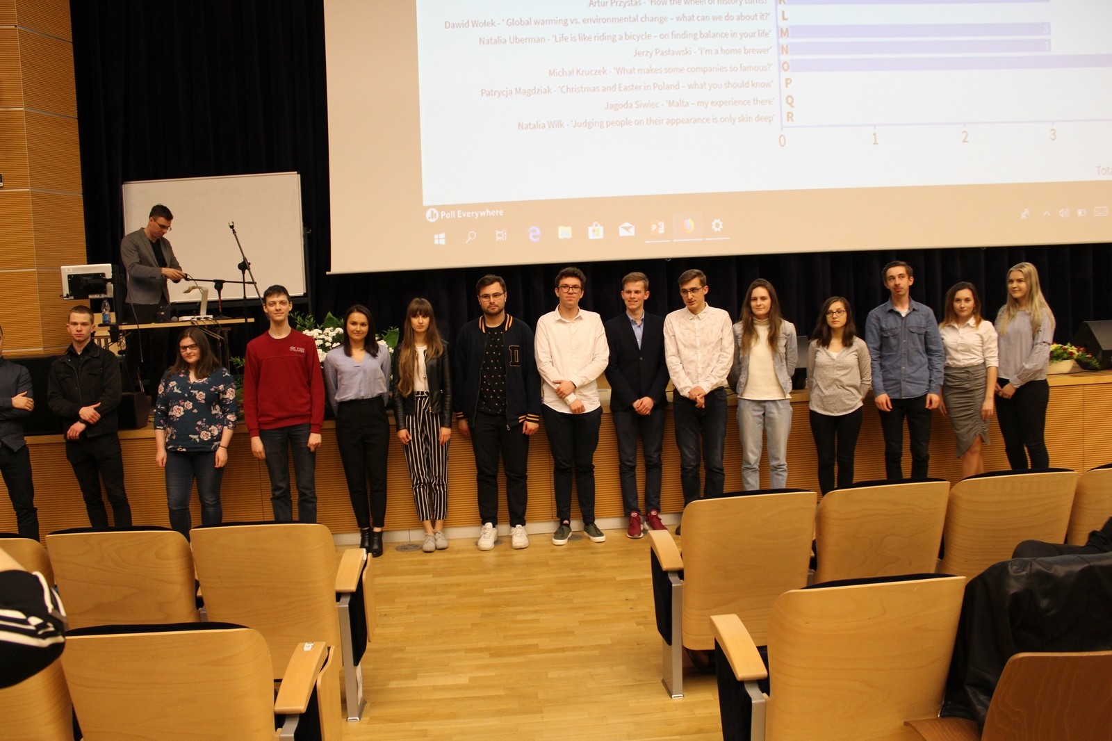 Należy tu podkreślić ogromny wkład pracy w przygotowanie tych wykładów, tym bardziej, że były one wygłaszane w języku angielskim. Wystąpienia publiczne nadal pozostają jednym z najbardziej stresujących przeżyć i doświadczeń dla wielu prelegentów, nasi mówcy jednak poradzili sobie z wyznaczonym wyzwaniem doskonale. Wszystkie prezentacje były błyskotliwe w przekazie i formie, a ich autorzy wykorzystywali slajdy, gadżety i rekwizyty dla poparcia swoich tez. Mogliśmy więc zobaczyć ślicznego czekoladowego zajączka owiniętego w złotą folię z czerwoną kokardką, który w pewnym momencie pod naciskiem pęka i okazuje się, że w środku jest pusty. W ten sposób Natalia Wilk starała się udowodnić, że nasza powierzchowność bez odpowiedniego wnętrza i osobowości nie ma większego znaczenia. Bardzo ciekawy, poparty prezentacją w Power Poincie był również wykład Arkadiusza Kalandyka, mówiącego o zagrożeniach wynikających z rozwijającej się dziedziny automatyzacji. Ola Pazdan ubrana w granatowy szkolny mundurek dowodziła, iż powszechne niezadowolenie wynikające z przymusu ich noszenia uzasadnione jest ich mało atrakcyjną formą, co więcej jednakowy ubiór dla wszystkich uczniów tłumi poczucie indywidualności oraz ogranicza wolność. Tomek Warcholak sugerował, że nauka języka angielskiego przychodzi dużo łatwiej, jeżeli odbywa się na podstawie treści, które nas interesują. I tak on sam nauczył się bardzo płynnej komunikacji podczas gier komputerowych, które umożliwiały mu kontakt z młodymi ludźmi z całego świata. Karolina Panek, swobodną angielszczyzną opowiadała o tym, jak została Youtuberką oraz z wielkim zaangażowaniem mówiła o pokonywaniu własnych słabości i lęków w dążeniu do realizacji swoich ambicji muzycznych. Muzyka to również świat zainteresowań Bartosza Kopaczyńskiego, którego piękny akcent brytyjski zachwycił jurorów. Bartek dał popis swoich umiejętności kończąc swój wykład przy akompaniamencie gitary. Marcelina Bełzo dowodziła, że w języku najważniejsza jest umiejętność komunikacji, nie akcent, którym się posługujemy. Bardzo piękne i motywujące wystąpienie przygotowała Kasia Ślęp mówiąca o sposobach pokonywania strachu przed wystąpieniem publicznym. Prezentacja Natalii Marciniec dotyczyła środowiska pracy i tego jak my Polacy podchodzimy do obowiązków zawodowych. Bartłomiej Nawoj, zdobywca pierwszej nagrody, zwrócił uwagę na niebezpieczeństwo dalszego rozwoju sztucznej inteligencji, która w niedalekiej przyszłości może wyeliminować człowieka. Michał Pogan w swoim wykładzie How would you live your life if you knew you would die in a year? mówił o tym jak pożytkujemy swój czas i ile tak naprawdę go marnujemy. Piękna i niezwykle pouczająca była prezentacja Artura Przystasia, który dowodził jak ważna jest znajomość historii, pozwalająca na uniknięcie ryzykownych zachowań analogicznych do tych jakie miały miejsce w przeszłości. Dawid Wołek mówił o naszych indywidualnych możliwościach walki z globalnym ociepleniem, a Michał Kruczek na przykładzie wielkich przedsiębiorców i biznesmenów pokazał, że osiągnięcie sukcesu jest możliwe, jeśli jesteś wizjonerem, kreatorem i nie boisz się odważnych wyzwań. Jerzy Pasławski wykazał się ogromną wiedzą na temat piwa i sposobów jego warzenia. Ogromne zdziwienie wywołało wprowadzenie na scenę roweru stacjonarnego, którego właścicielka Natalia Uberman przekonywała, że podobnie jak na rowerze tak i w życiu, aby móc poruszać się naprzód musimy zachować harmonię, równowagę i być szczęśliwym.