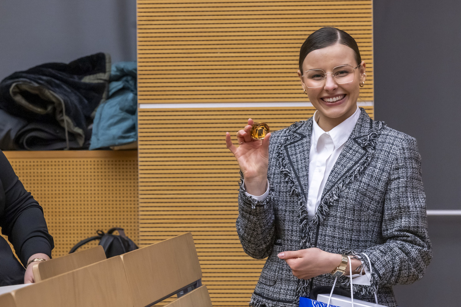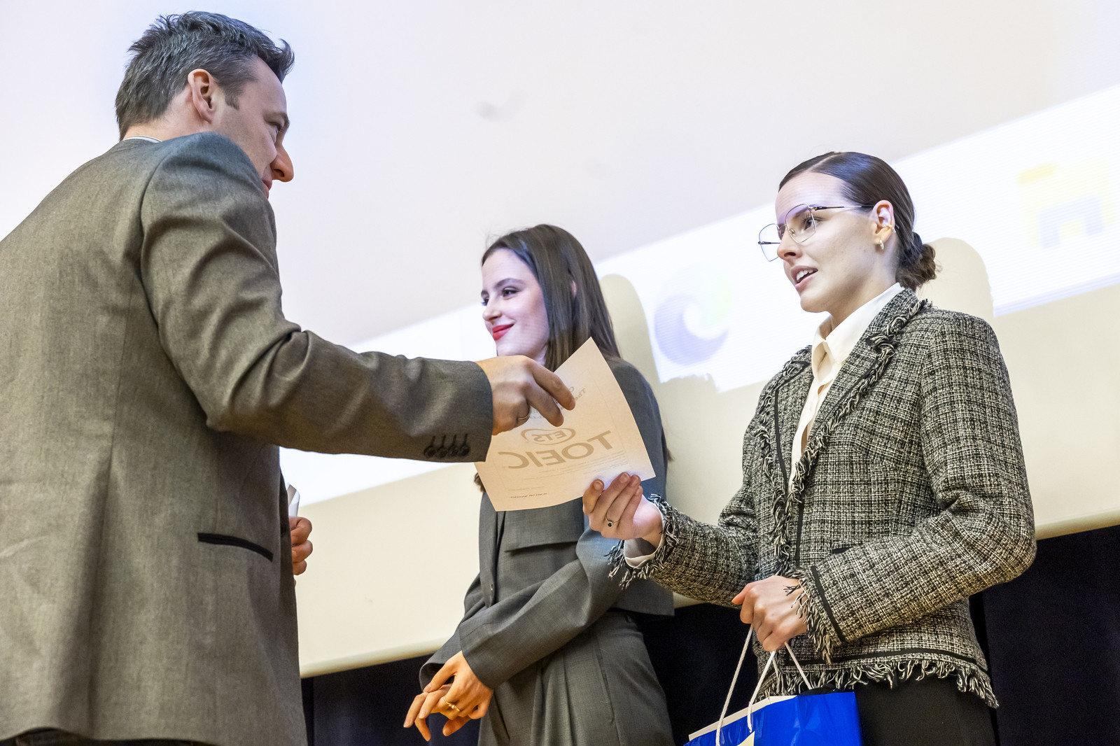 Nagroda publiczności – słuchawki bezprzewodowe oraz wstęp na test TOEIC a także zwolnienie z egzaminu językowego kończącego lektorat trafiła do Pani Anny Lesiak, która porwała publiczność zasiadającą na trybunach podczas konkursu tematem ‘The tale about a diamond’. Ta niezwykle urzekająca opowieść o tym, że nie powinniśmy się poddawać, nawet gdy mamy gorsze momenty zahipnotyzowała nas w taki sposób, że Pani Ania wygrała tę nagrodę zdobywając 22% wszystkich głosów oddanych na występujących przez publiczność zgromadzoną w auli, a także została wytypowana do drugiej nagrody w głosowaniu jury.