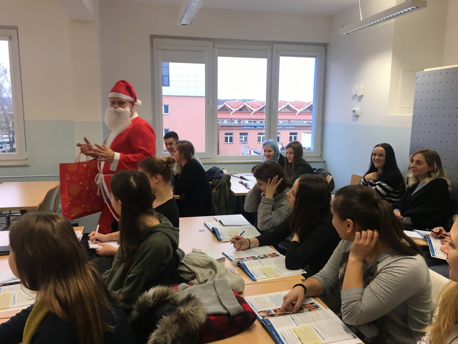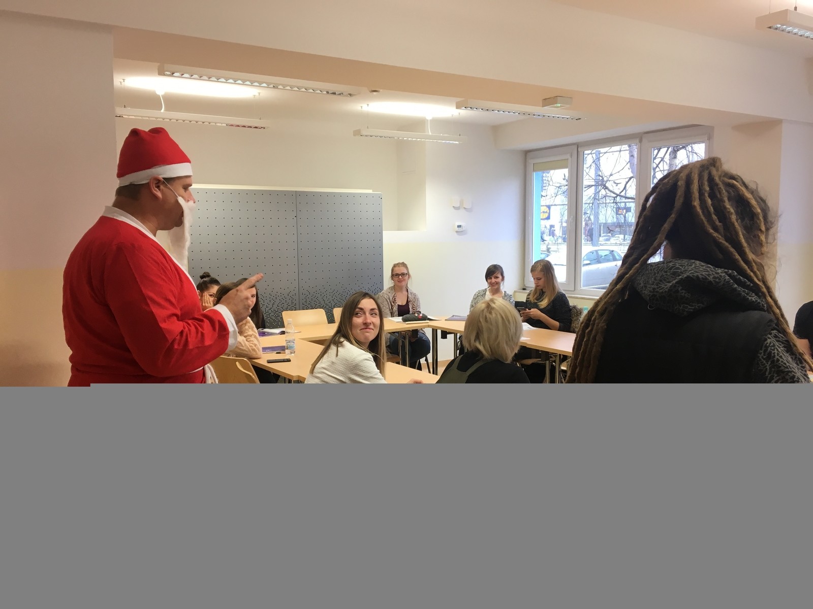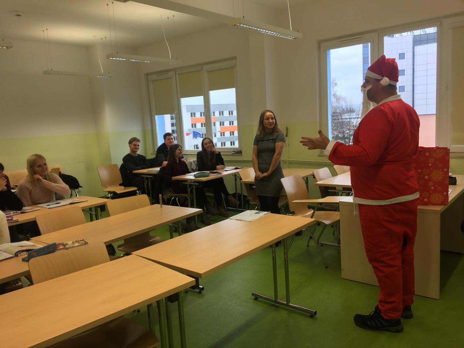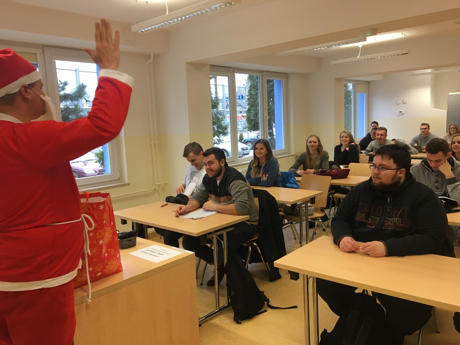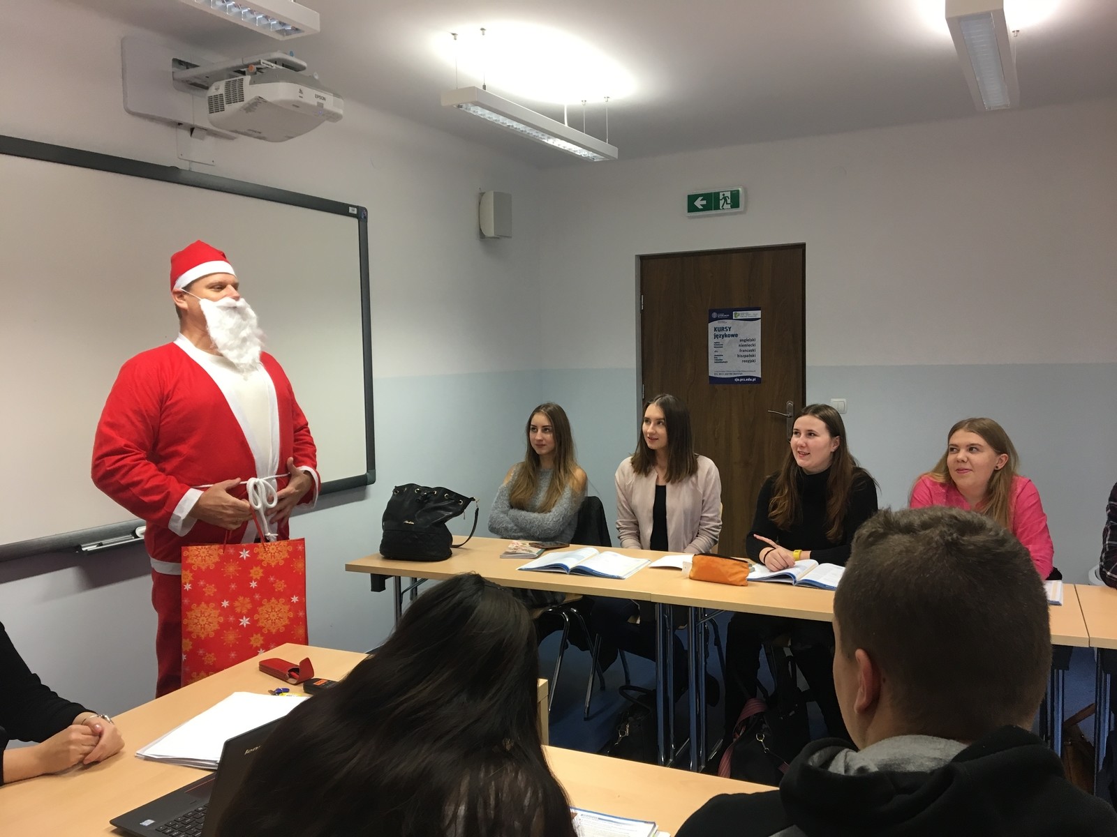 Dzisiaj w SJO zawitał niespodziewanie Święty Mikołaj. Przybył ze słodką niespodzianką i odwiedził wiele grup odbywających lektoraty w naszym budynku. Rozmawiał ze studentami, zadawał mnóstwo pytań i zachęcał do solidnej nauki języków obcych. Co najważniejsze, mówił wyłącznie po angielsku. Wzbudził ogromne zainteresowanie i radość, i z pewnością uprzyjemnił nasze zajęcia. Zapewnił, że przybył tu w nagrodę za doskonałe sprawowanie studentów PRz, ich zaangażowanie w lektoraty, oraz podkreślał, że świetna znajomość języków obcych jest ich atutem.