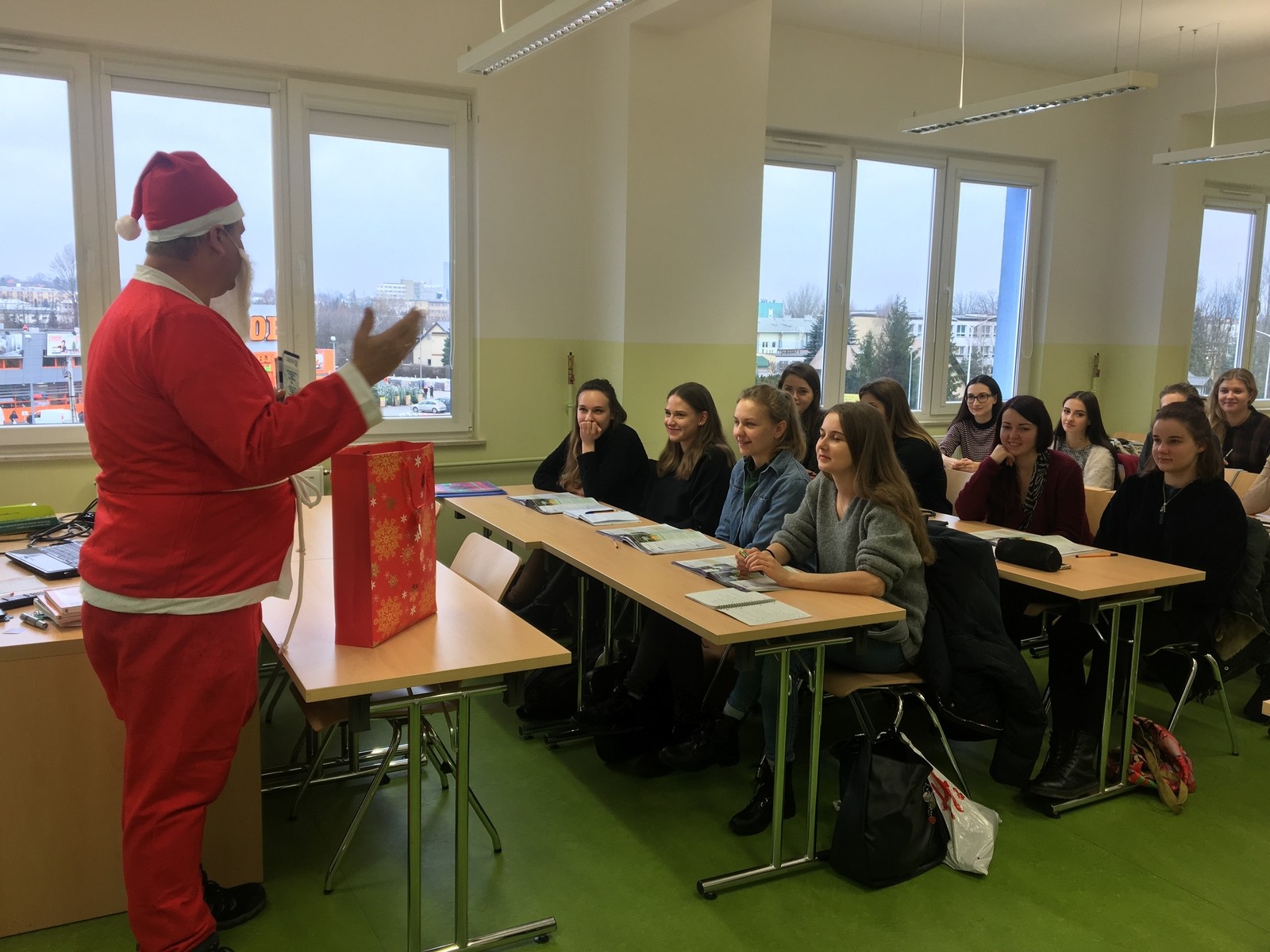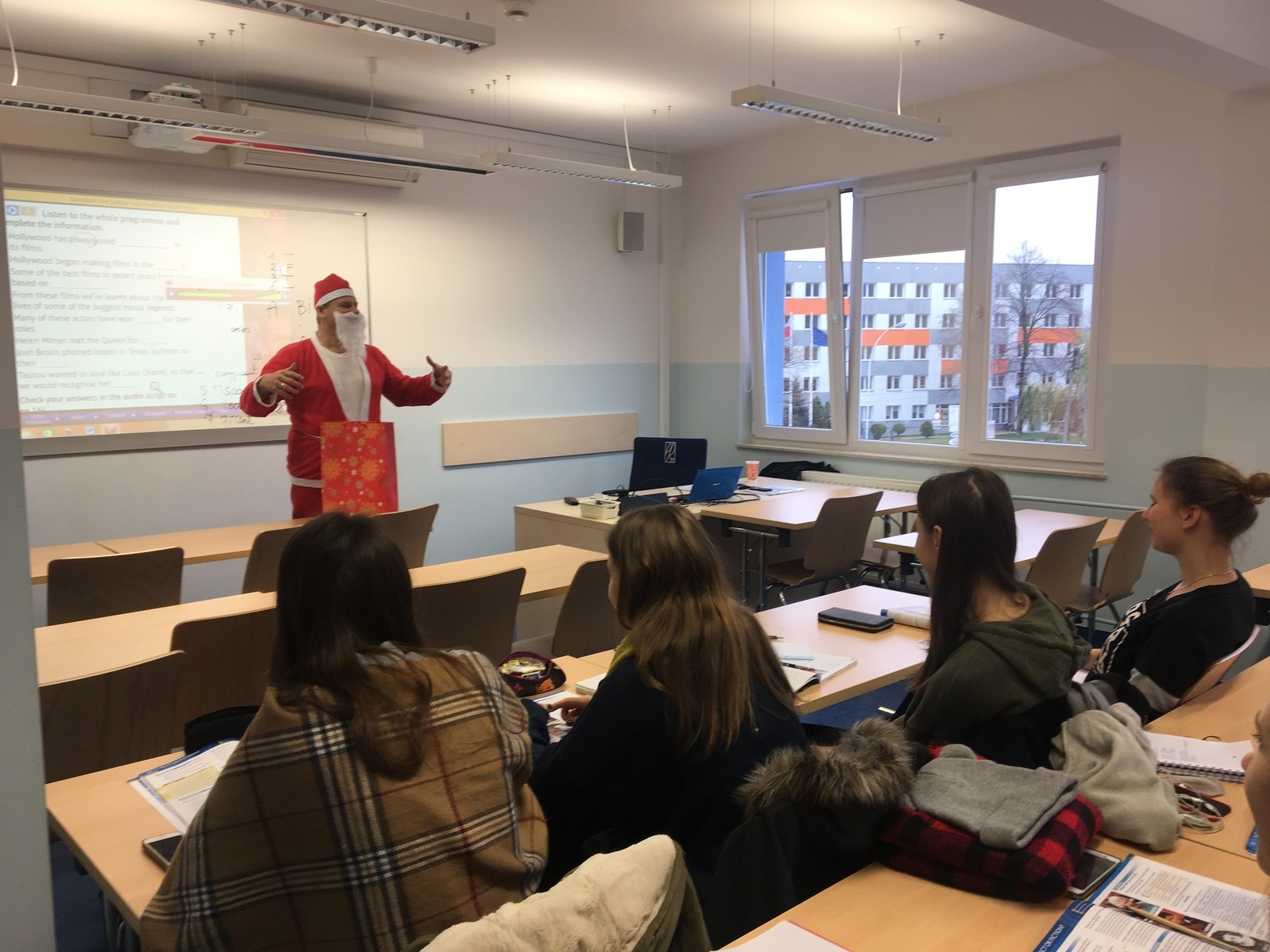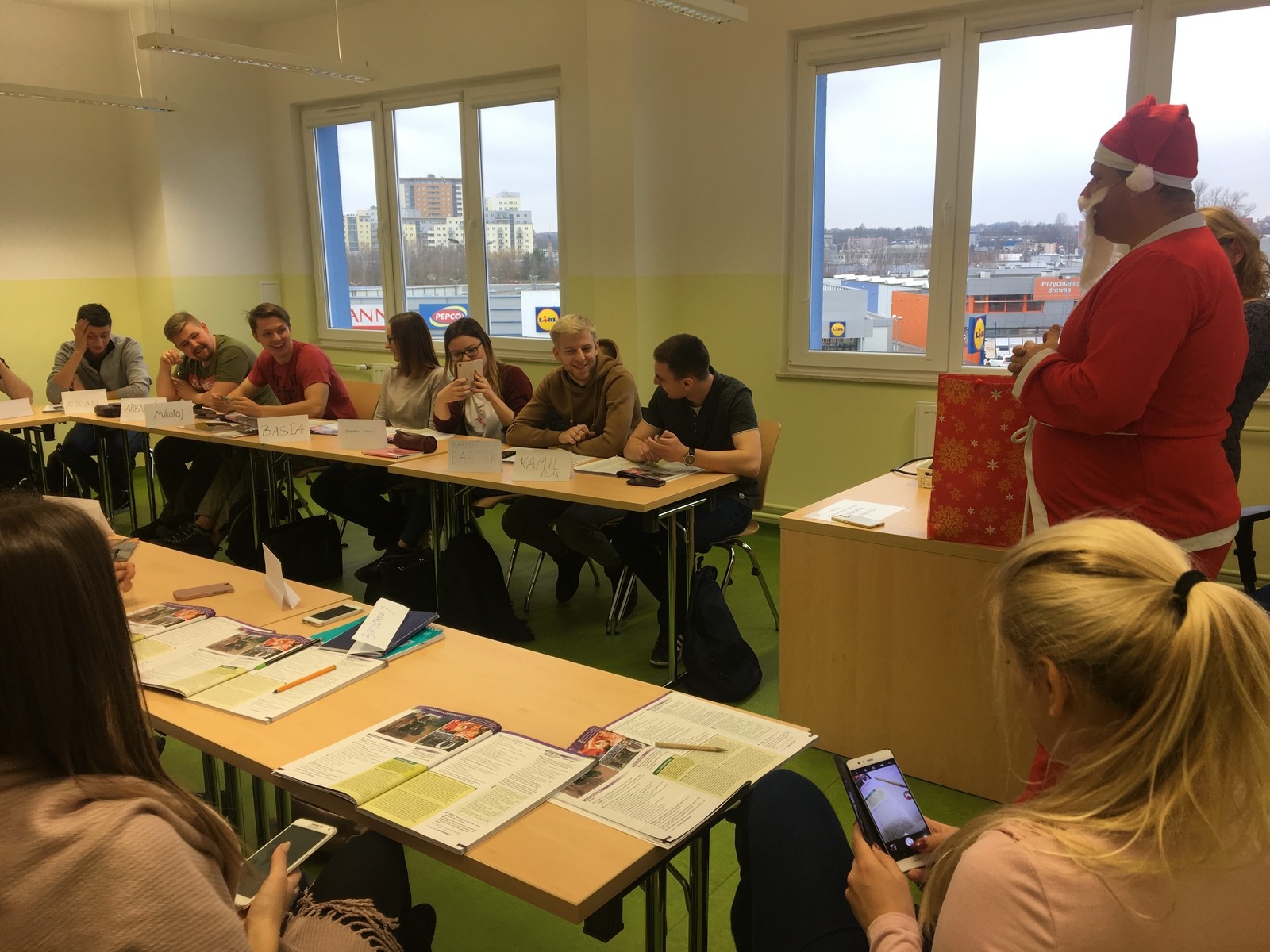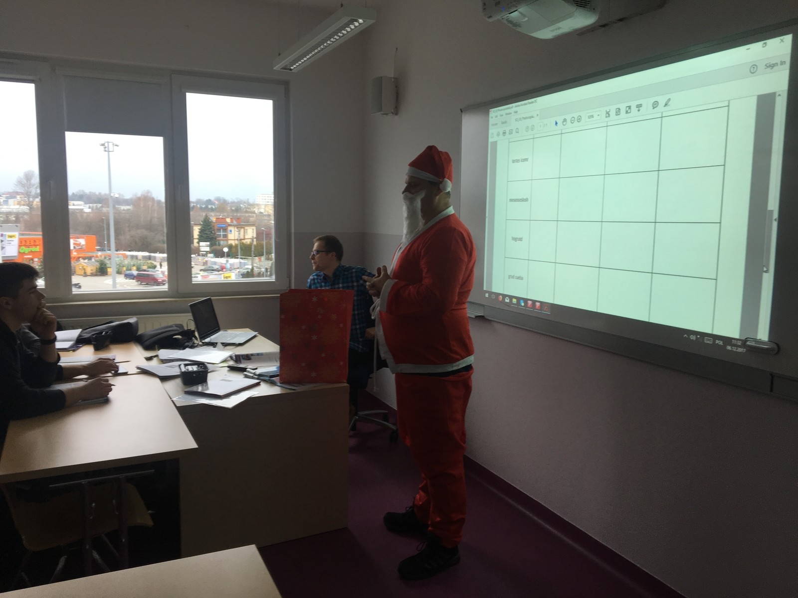 Dzisiaj w SJO zawitał niespodziewanie Święty Mikołaj. Przybył ze słodką niespodzianką i odwiedził wiele grup odbywających lektoraty w naszym budynku. Rozmawiał ze studentami, zadawał mnóstwo pytań i zachęcał do solidnej nauki języków obcych. Co najważniejsze, mówił wyłącznie po angielsku. Wzbudził ogromne zainteresowanie i radość, i z pewnością uprzyjemnił nasze zajęcia. Zapewnił, że przybył tu w nagrodę za doskonałe sprawowanie studentów PRz, ich zaangażowanie w lektoraty, oraz podkreślał, że świetna znajomość języków obcych jest ich atutem.