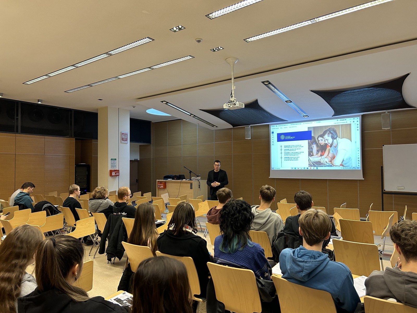 Bezpośrednio przed zajęciami uczniowie klasy 3E o profilu mat-fiz-ang, prowadzonej przez mgr Agnieszkę Piwińską-Malec, wysłuchali krótkiej prezentacji dotyczącej działalności CJO, zapoznając się ze stosowanym w naszej jednostce systemem nauczania języków obcych, ofertą dydaktyczną obejmującą różne języki i poziomy zaawansowania, stosowaną w CJO metodą blended-learning oraz poznając ofertę ogólnodostępnych kursów komercyjnych (ogólnych i specjalistycznych), jak również międzynarodowych egzaminów certyfikujących.