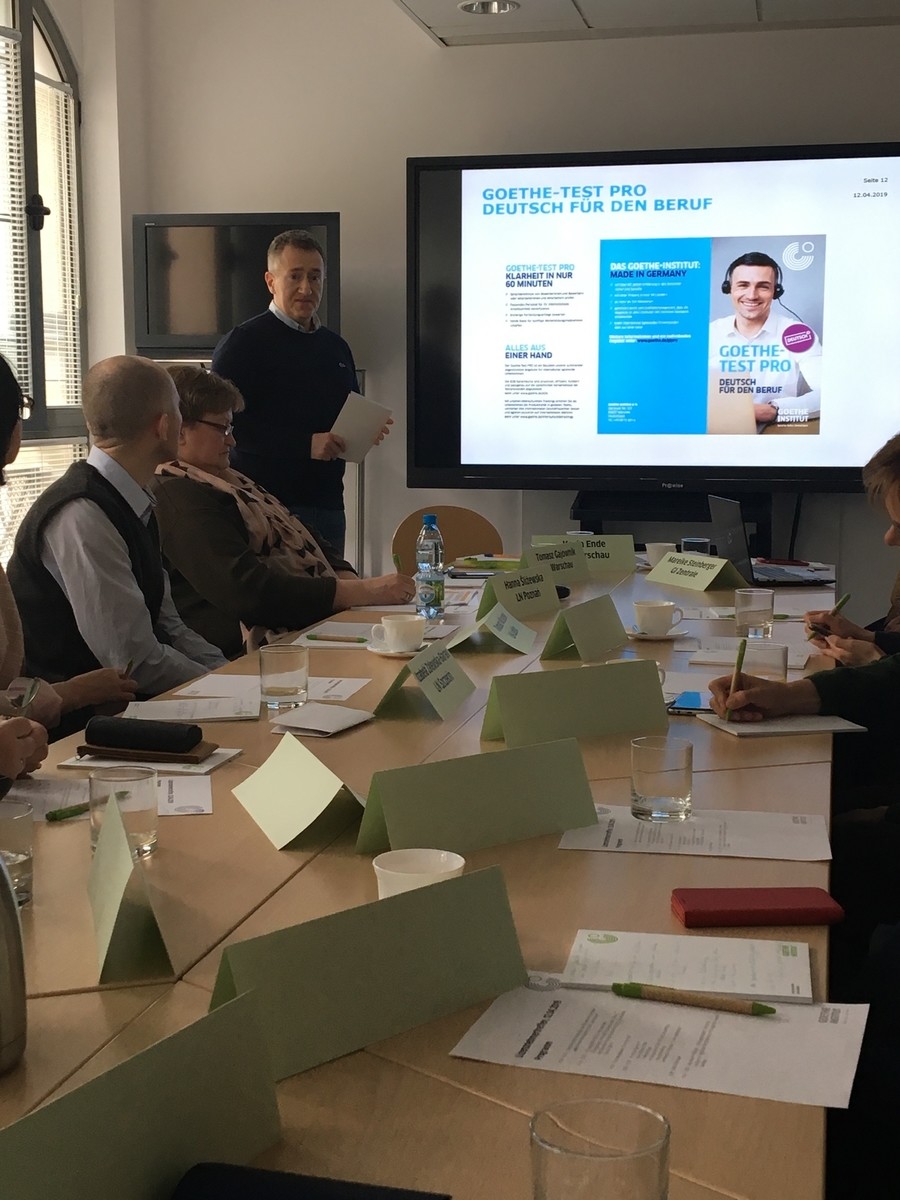 Tradycyjnie raz w roku odbywa się spotkanie przedstawicieli licencjonowanych Centrów Egzaminacyjnych Goethe-Institut w Polsce. Tym razem w miłej i serdecznej atmosferze przedświątecznej ale równocześnie w bardzo merytorycznej debacie nt. egzaminów z języka niemieckiego w naszym kraju uczestniczyli koordynatorzy z 11 centrów . Prelegentami byli Pani Karin Ende z Goethe-Institut Warszawa; Dyrektor Działu Językowego , Zastępca Dyrektora Instytutu, Pani Mareike Steinberger Dyrektor Działu Językowego z Goethe –Institut Monachium , Pan Tomasz Gajownik Dyrektor Kursów i Egzaminów GI Warszawa oraz Pani Agnieszka Skotarek prowadząca spotkanie Zastępca Dyrektora Kursów i Egzaminów GI Warszawa.
